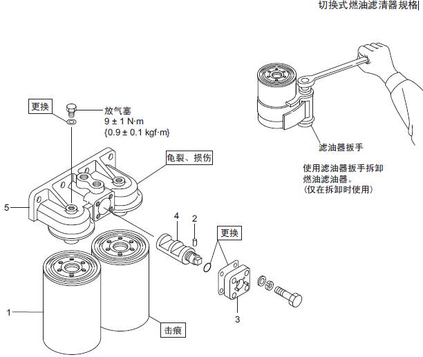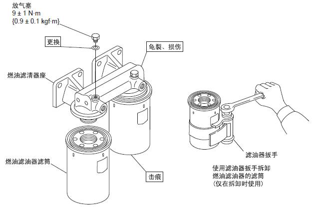 2.1 三菱S6R發(fā)動機燃油濾清器的解體,檢修,組裝( 紙質濾芯)