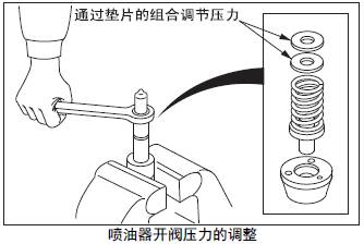 (3) 三菱S6R發(fā)動機調(diào)整噴油壓力時,先拆除噴油器的定位螺釘,旋松蓋螺帽,用螺絲刀旋轉調(diào)節(jié)螺釘。