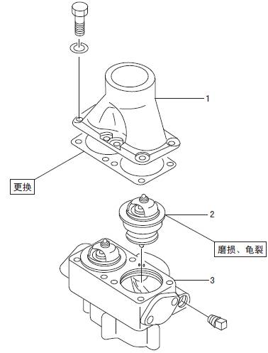 1 三菱S6R發(fā)動機恒溫器端蓋  2 三菱S6R發(fā)動機恒溫器  3 三菱S6R發(fā)動機恒溫器密封