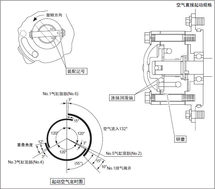 注: 三菱S6R柴油發(fā)動(dòng)機(jī)分配閥組裝時(shí),要對(duì)準(zhǔn)裝配記號(hào)。安裝出錯(cuò)時(shí),360° 起動(dòng)空氣定時(shí)會(huì)發(fā)生錯(cuò)亂導(dǎo)致不能起動(dòng)。
