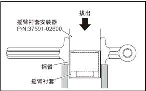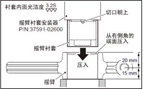(2) 使用搖臂襯套工具,壓入新的搖臂襯套。搖臂襯套安裝定位用切口( 寬4mm) 向上對準(zhǔn)圖示位置, 從搖臂孔有倒角的端面?zhèn)葔喝胍r套。