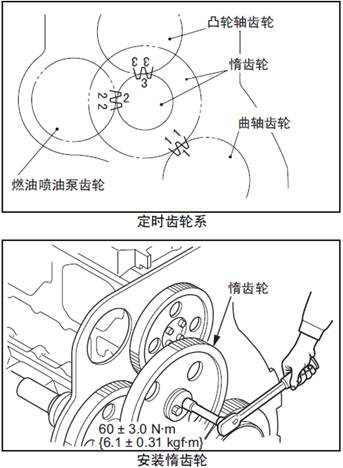 (3) 對準裝配記號后安裝惰齒輪。