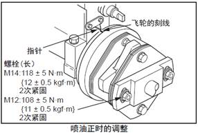 (1) 緩慢地正向盤(pán)車,使減振器上的規(guī)定噴油正時(shí)刻線和發(fā)動(dòng)機(jī)的指針一致。