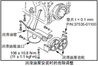 齒隙不符標(biāo)準(zhǔn)值時(shí),在潤滑油泵安裝部位插入墊片進(jìn)行調(diào)整。
