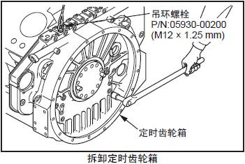 (2) 將三菱S12柴油發(fā)動機(jī)正時(shí)齒輪箱吊住并向外移動至脫出定位銷后拆下。