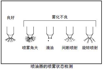 在三菱S12柴油發(fā)動(dòng)機(jī)噴油器試驗(yàn)臺(tái)上調(diào)整壓力的同時(shí),檢查噴孔堵塞、噴霧狀態(tài)以及噴孔內(nèi)有無(wú)漏油現(xiàn)象等。噴霧不良時(shí),清洗或更換噴油嘴。