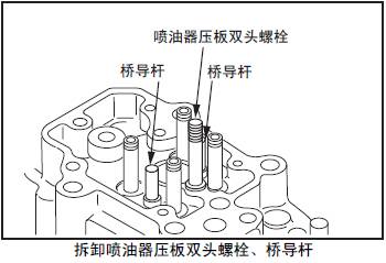 拆卸時參照「三菱R16柴油發(fā)動機本體的檢測、修理」的「三菱R16柴油發(fā)動機噴油器壓板雙頭螺栓、橋?qū)U的檢測,更換」項。