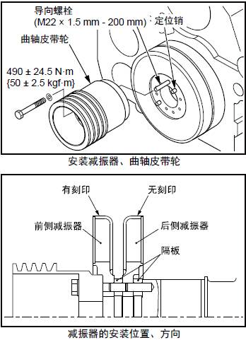 (2) 按照隔板、內(nèi)側(cè)的三菱R16柴油發(fā)動機減振器、隔板、外側(cè)的三菱R16柴油發(fā)動機減振器、三菱R16柴油發(fā)動機曲軸三菱S16柴油機皮帶輪的順序,通過導(dǎo)向螺栓,對準(zhǔn)定位銷進行安裝。