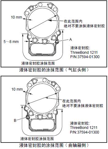 (2) 在氣缸墊片兩面的套筒孔和潤滑油通路周圍薄薄涂抹液體密封膠。液體密封膠的涂抹范圍,在氣缸墊片外周的5 ~ 8 mm,厚度0.2 ~ 0.5 mm。詳細涂抹范圍參考右圖。