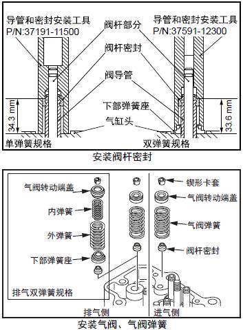 (d) 使用排氣雙三菱R16柴油發(fā)動機氣閥彈簧時,在安裝三菱R16柴油發(fā)動機閥桿密封前先安裝下部彈簧座。