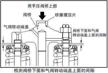 用手壓住閥橋,使閥桿上端面接觸,檢測閥橋下面和氣閥轉(zhuǎn)動端蓋上面的間隙。間隙小于標準值時,確認故障的部件后更換新品。