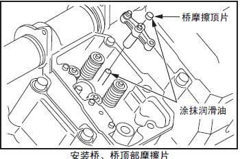 (3) 在橋頂部摩擦片和橋的接觸面涂抹潤滑油,安裝頂部摩擦片。注意橋頂部摩擦片不要從頂桿孔落入三菱R16柴油發(fā)動機三菱R16柴油發(fā)動機缸體內(nèi)。
