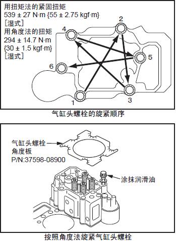 旋緊三菱R16柴油發(fā)動機氣缸頭螺栓的方法,有扭矩法和角度法。