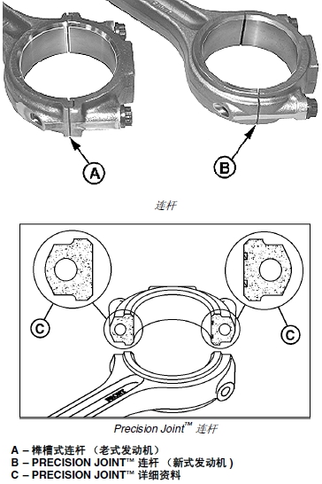 老式John Deere約翰迪爾強(qiáng)鹿柴油發(fā)動(dòng)機(jī)的連桿和連桿瓦蓋之間采用傳統(tǒng)的榫槽式連接 (A)。新式John Deere約翰迪爾強(qiáng)鹿柴油發(fā)動(dòng)機(jī)具有 PRECISION JOINT™ 連桿和瓦蓋 (B)。
