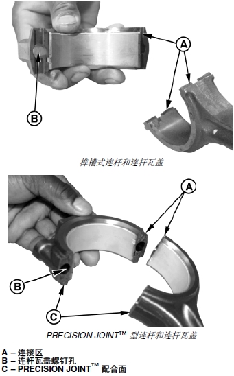 重要提示: 不得劃傷連桿和連桿瓦蓋的連接面。對于確保 PRECISION JOINT™ 連桿正確安裝來說,這是非常重要的。禁止用鋼絲刷或其他工具刷連接面 (C)。必須保護(hù)互鎖配合面。