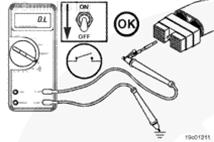 將開關(guān)置于 OFF(斷開)位置并測(cè)量電阻。萬用表必須顯示閉路(10 歐姆或更小)。如果電路沒有閉合,則開關(guān)故障。關(guān)于更換步驟,參考 OEM 故障判斷和排除手冊(cè)。如果電阻值正確,必須檢查開關(guān)是否仍舊存在對(duì)地短路。