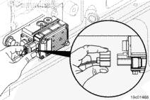 鑰匙開(kāi)關(guān)位于“OFF”(斷開(kāi))位置。 從渦輪增壓器控制閥上斷開(kāi)電氣線束。 為了拆下接頭,將食指放在接頭脫扣裝置上,將拇指放在接頭上,同時(shí)用食指壓脫扣裝置,如圖所示。 向里按脫扣裝置并且抓住插頭用力拉來(lái)拆下接頭,如圖所示。