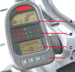 液壓剪選擇指示燈 C :MCD (信息中心顯示器)——轉(zhuǎn)速, 設(shè)置模式,故障代碼 D :滾動(dòng)/確認(rèn)按鈕
