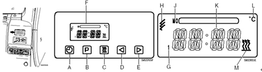 沃爾沃VOLVO B 系列挖掘機(jī)發(fā)動(dòng)機(jī)柴油加熱器 A時(shí)間設(shè)置開(kāi)關(guān) B程序開(kāi)關(guān) C加熱“開(kāi)/關(guān)”開(kāi)關(guān) D倒退開(kāi)關(guān) E前進(jìn)開(kāi)關(guān) F顯示窗口G記憶指示器 F遙控器符號(hào) J程序日 K當(dāng)前時(shí)間/計(jì)劃時(shí)間 L溫度顯示器 J加熱指示器