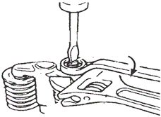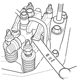 不要在松開(kāi)氣門(mén)橋的狀態(tài)下松開(kāi)或鎖緊氣門(mén)調(diào)整螺栓螺母。用扳手固定氣門(mén)橋防止氣門(mén)桿彎曲。然后松開(kāi)氣門(mén)橋調(diào)整螺栓的螺母。