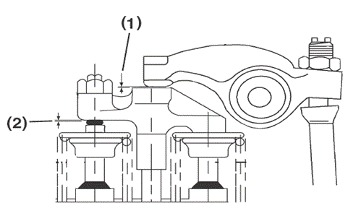對(duì)于四氣門(mén)汽缸頭,兩氣門(mén)是由在兩氣門(mén)之間的單一搖臂通過(guò)氣門(mén)橋帶動(dòng)的。在調(diào)整搖臂和氣門(mén)橋之間的間隙1前該間隙2應(yīng)首先設(shè)置。