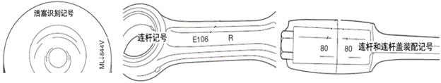 當(dāng)活塞裝配正確時(shí),刻印在連桿頂部的標(biāo)識(shí) 會(huì)和刻印在連桿上連桿和連桿蓋的裝配記號(hào)處于同一側(cè)。(106T系列除外)
