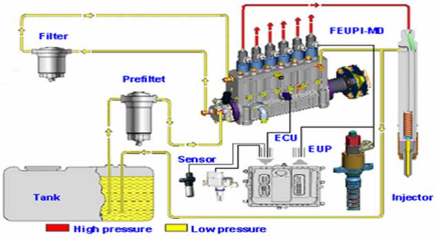 由一汽集團公司(FAW)將德爾福成熟的電控單體泵(EUP)集成(Integration)為FEUPI電控直列泵噴油系統(tǒng),ECU采用MOTOROLA,傳感器采用西門子。