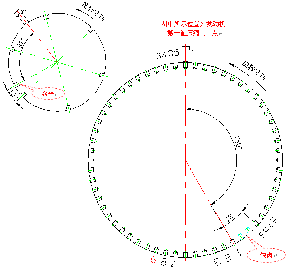 Ø 曲軸傳感器應(yīng)該指示到曲軸信號盤缺齒后的第36個(gè)齒(參見圖中齒的編號),或第2個(gè)齒后210°(曲軸轉(zhuǎn)角)的位置(圖中所示標(biāo)注150°=360°-210°)