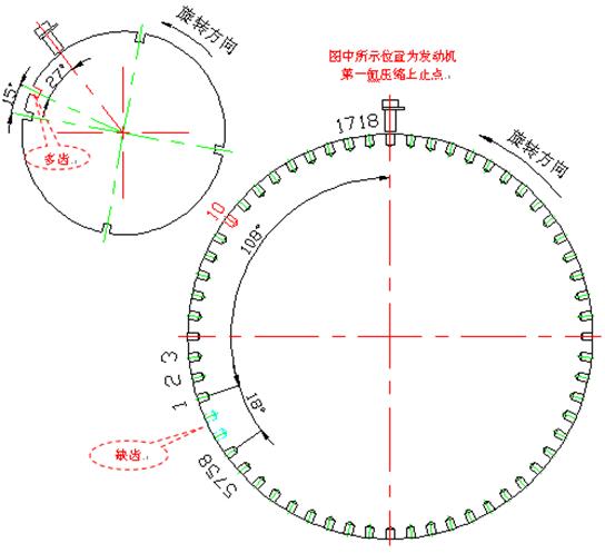 Ø 曲軸傳感器應(yīng)該指示到曲軸信號盤缺齒后的第19個(gè)齒(參見圖中齒的編號),或缺齒后108°(曲軸轉(zhuǎn)角)的位置