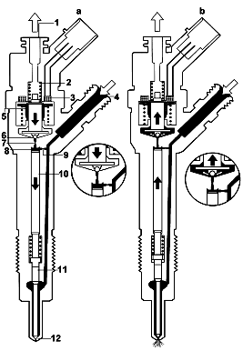 當(dāng)噴油器的電磁閥被觸發(fā),泄油孔被打開,這引起控制腔的壓力下降,結(jié)果,活塞上的液壓力也隨之下降,一旦液壓力降至低于作用于噴油嘴針閥承壓面上的力,針閥被打開,燃油經(jīng)噴孔噴入燃燒室。這種對(duì)噴油嘴針閥的不直接控制采用了一套液壓力放大系統(tǒng),因?yàn)榭焖俅蜷_針閥所需的力不能直接由電磁閥產(chǎn)生,所謂的打開針閥所需的控制作用,是通過(guò)電磁閥打開泄油孔使得控制腔壓力降低,從而打開針閥。