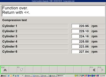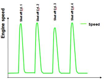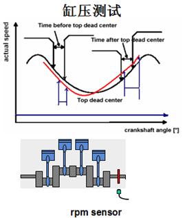 缸壓測試時,ECU停止對發(fā)動機的噴油。起動機帶動發(fā)動機運轉(zhuǎn)。電腦同時測量各缸壓縮,膨脹階段的轉(zhuǎn)速。