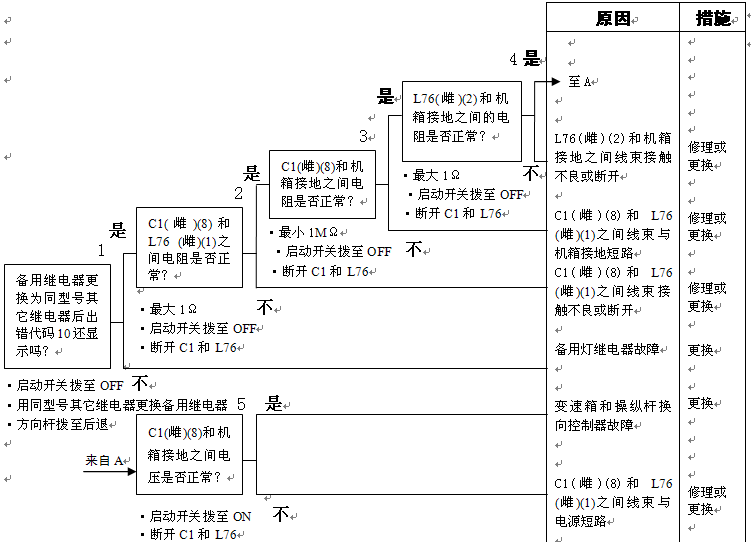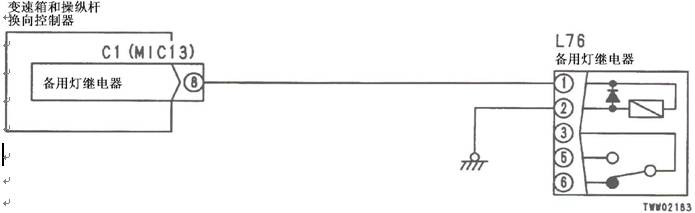 1)備用燈繼電器故障 2)變速箱和操縱桿控制器C1(雌)(8)L76(1)之間線束與電源短路,與機(jī)箱接地短路,觸點(diǎn)有故障或斷開 3)后燈繼電器L76(雌)(2)和機(jī)箱接地之間線束觸點(diǎn)有故障或斷開 4)變速箱和操縱桿控制器有故障 | ||||