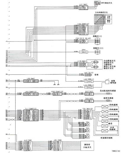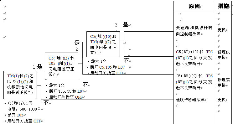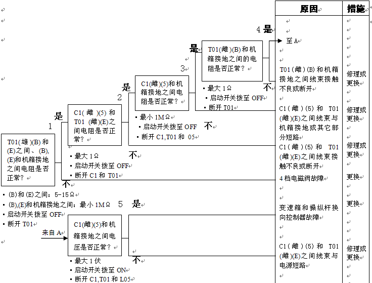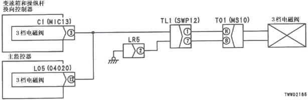 1)3檔電池閥故障 2)變速箱和操縱桿控制器C1(雌)(5)-TL1(3)-T01(F)之間線束與電源短路,與機(jī)箱接地短路,觸點(diǎn)有故障或斷開 3)機(jī)箱-TL1(7)-T01(B)之間線束與機(jī)箱接地短路,觸點(diǎn)有故障或斷開 4)變速箱和操縱桿控制器有故障 | ||||