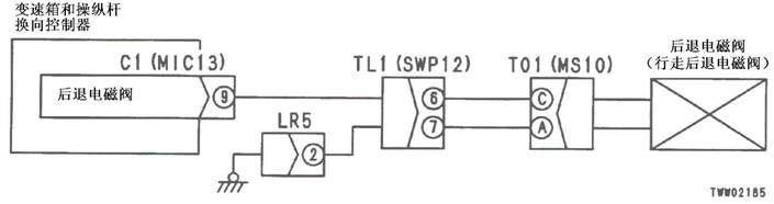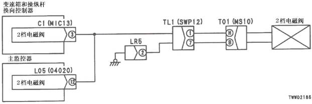1)2檔R電池閥故障 2)變速箱和操縱桿控制器C1(雌)(10)-TL1(2)-T01(G)之間線束與電源短路,與機(jī)箱接地短路,觸點(diǎn)有故障或斷開 3)機(jī)箱-TL1(7)-T01(B)之間線束與機(jī)箱接地短路,觸點(diǎn)有故障或斷開 4)變速箱和操縱桿控制器有故障 | ||||