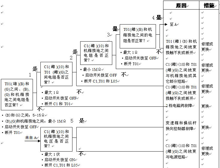 1)變速箱和操縱桿控制器C1(雌)(11)和機(jī)箱接地之間的電阻:5-15Ω 2)變速箱和操縱桿控制器C1(11)和機(jī)箱接地在空擋時(shí)的電壓:小于1伏 |