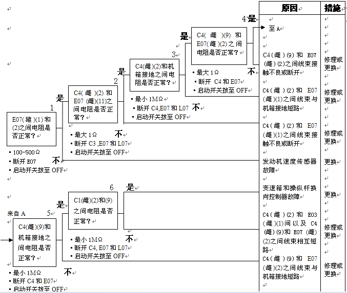 1)速度傳感器故障 2)速度傳感器安裝調(diào)整故障 3)變速箱和操縱桿控制器C4(雌)(2)-LR3(7)-ER2(9)-E07(1)之間線束觸點(diǎn)有故障或斷開 4)變速箱和操縱桿控制器C4(雌)(9)-LR3(8)-ER2(10)-E07(2)之間線束觸點(diǎn)有故障或斷開 5)變速箱和操縱桿控制器有故障 |