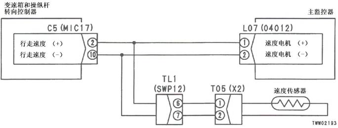 1)行走速度傳感器T05(1)和(2)之間電阻:500-1,000Ω 2)變速箱和操縱桿控制器C5(雌)(2)和(10)之間的電壓:最小0.5伏 |