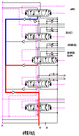 動(dòng)臂提升合流BOOM2閥把泵1的流量引到動(dòng)臂大腔,實(shí)現(xiàn)合流。