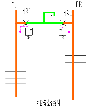 當(dāng)閥處于中位時(shí),P1,P2通過閥的中位油道,最后經(jīng)過NR1,NR2節(jié)流后回油箱,在節(jié)流口NR1,NR2前取得壓力信號FL,F(xiàn)R,就可以控制主泵到最小排量。