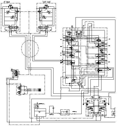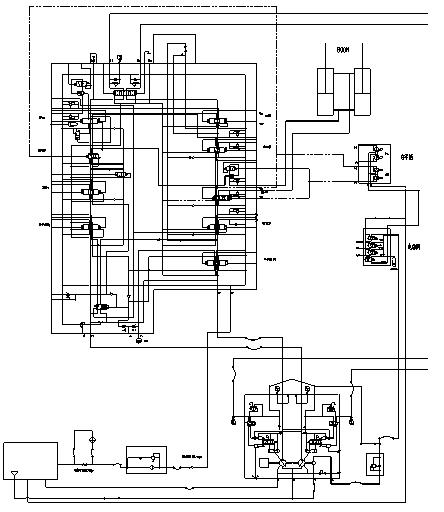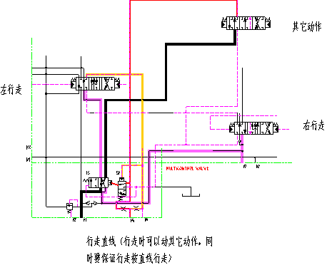 1.2.3行走直線功能,當(dāng)挖掘機(jī)陷入坑中或其它特殊工況時(shí),要求挖掘機(jī)能邊行走邊動(dòng)工作裝置(動(dòng)臂、斗桿、鏟斗、回轉(zhuǎn)),能實(shí)現(xiàn)挖掘機(jī)的自救或其它功能,其工作原理如下: