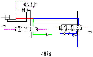 斗桿合流是通過ARM2閥把泵2的流量引到斗桿大腔或小腔,實(shí)現(xiàn)合流。