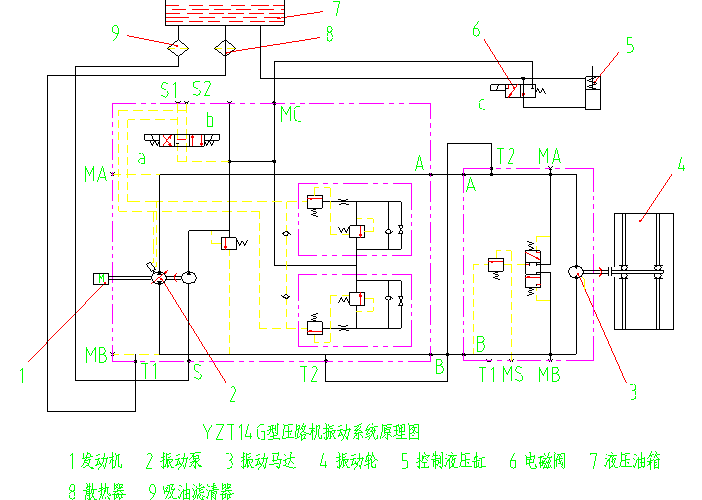 由附圖可知,振動泵2把發(fā)動機(jī)飛輪輸出的機(jī)械能轉(zhuǎn)換成高壓油液的壓力能,再通過接頭、膠管等輔助元件傳遞給振動馬達(dá)3;振動馬達(dá)3把高壓油液的壓力能轉(zhuǎn)換為機(jī)械能,而后通過聯(lián)軸節(jié)驅(qū)動振動軸旋轉(zhuǎn),使振動輪產(chǎn)生振動。通過控制元件——三位電磁換向排量控制閥a和b的作用,振動泵2可以截止或改變高壓油流的方向,從而實(shí)現(xiàn)振動馬達(dá)停止旋轉(zhuǎn)或改變其旋向,使振動輪停振或?qū)崿F(xiàn)大、小振幅的振動:當(dāng)電磁閥a和b均不帶電時,振動馬達(dá)不旋轉(zhuǎn),振動輪不振動;當(dāng)電磁閥a帶電時,振動馬達(dá)為順時針方向旋轉(zhuǎn)(從馬達(dá)軸端面看),振動輪內(nèi)大小偏心塊的質(zhì)量偏心矩疊減,變成小振幅振動。