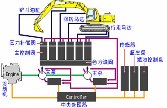 液壓挖掘機的動力裝置是由發(fā)動機、散熱器、連軸器及輔助元件組成。它主要是發(fā)動機和五大系統(tǒng)組成,如下圖所示: