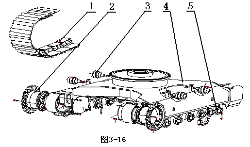 1-履帶;2-行走馬達及驅(qū)動輪;3-托鏈輪;4-X型車架;支重輪