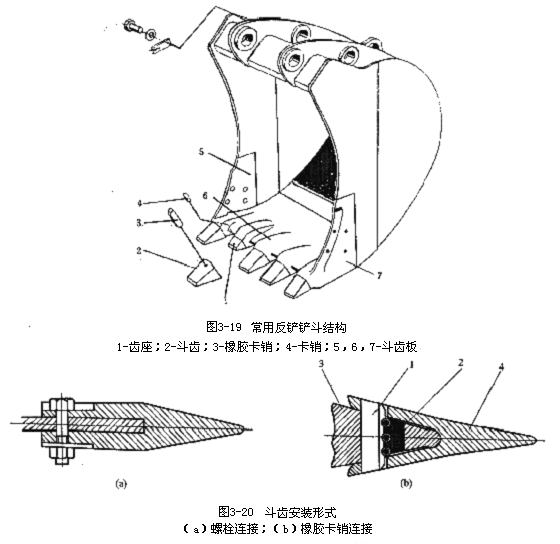 反鏟用的鏟斗形狀、尺寸與其作業(yè)對象有很大關(guān)系。為了滿足各種挖掘作業(yè)的需要,在同一臺挖掘機上可配以多種結(jié)構(gòu)型式的鏟斗,見圖3-19、圖3-20分別為反鏟用鏟斗的基本形式和常用形式。鏟斗的斗齒采用裝配式,其形式有橡膠卡銷式和螺栓連接式,如圖2-5所示。