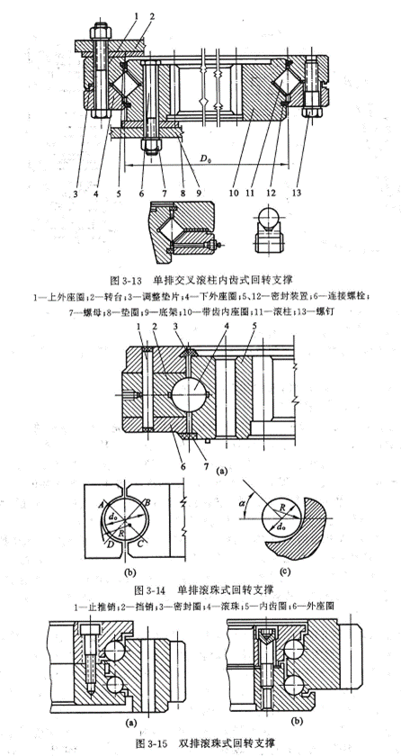 單斗液壓挖掘機用回轉(zhuǎn)支撐的結(jié)構(gòu)型式,實現(xiàn)上部平臺的回轉(zhuǎn),回轉(zhuǎn)支撐按結(jié)構(gòu)形式分為轉(zhuǎn)柱式和滾動軸承式等兩種,見圖3-13、圖3-14、圖3-15。