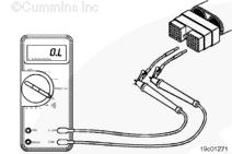 將測試導(dǎo)線插入 OEM 線束接頭上的 SAE J1939 數(shù)據(jù)通信接口正極 (+) 觸針,并將其連接到萬用表表筆上。將其他測試導(dǎo)線插入 9-針 Deutsch™ 接頭上的 SAE J1939 數(shù)據(jù)通信接口正極 (+) 觸針,并將其連接到萬用表。