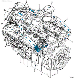 在空氣由渦輪增壓器壓縮后,康明斯K38 和 K50 發(fā)動(dòng)機(jī)利用外置中冷器冷卻空氣。中冷器安裝在進(jìn)氣歧管中,有一個(gè)固定中冷器芯的平板蓋。每個(gè)發(fā)動(dòng)機(jī)有 4 個(gè)進(jìn)氣歧管、4 個(gè)中冷器芯和 4 個(gè)中冷器蓋??諝馔ㄟ^(guò)空氣跨接管由渦輪增壓器直接導(dǎo)入中冷器總成。不管有幾個(gè)渦輪增壓器,每個(gè)發(fā)動(dòng)機(jī)都有兩個(gè)空氣跨接管。