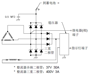 � 交流發(fā)電機(jī)裝有整體式硅整流器。一個(gè)裝在交流發(fā)電機(jī)內(nèi)部的晶體管穩(wěn)壓器,限