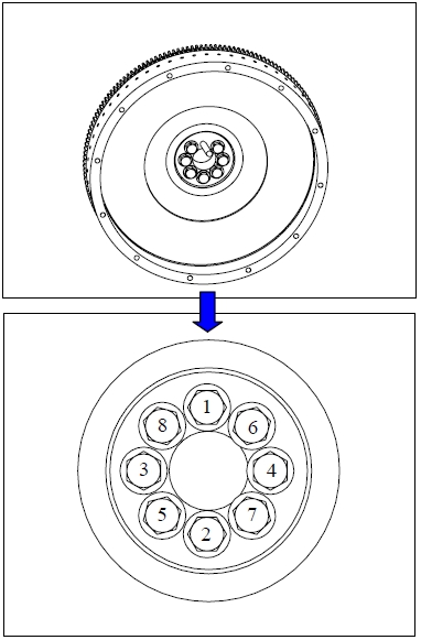 � 將導(dǎo)向銷插入飛輪孔中并暫時擰緊固定螺栓2∼3 個螺紋后,按擰緊順序(鋸齒形順序)將其擰緊至規(guī)定扭矩。